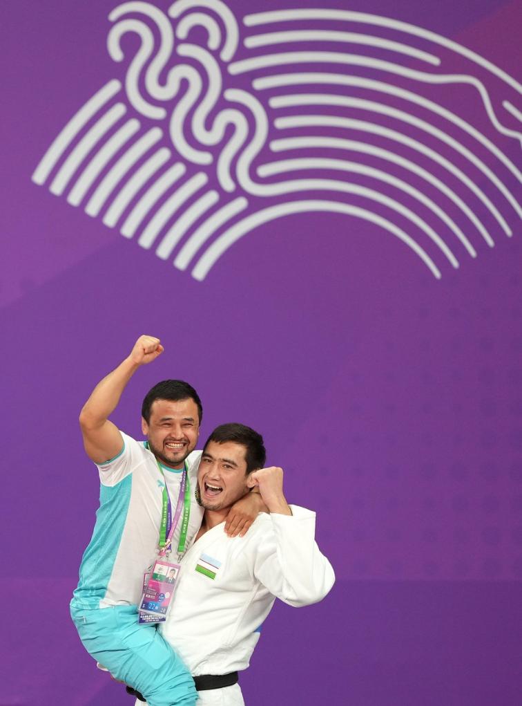Gold medalist MuzaffarbekTuroboyev (R) of Uzbekistan celebrates with his coach after the Men 100kg of Judo at the 19th Asian Games in Hangzhou, east China's Zhejiang Province, Sept. 26, 2023. (Xinhua/Wan Xiang)