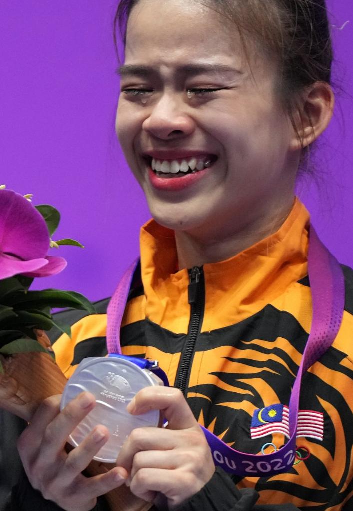 Silver medalist Tan Cheong Min of Malaysia reacts during the awarding ceremony for Women's Nanquan & Nandao All-round of Wushu at the 19th Asian Games in Hangzhou, east China's Zhejiang Province, Sept. 26, 2023. (Xinhua/Li Yibo)