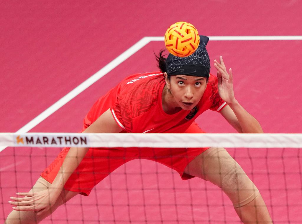 Florensia Cristy of Indonesia competes during the Women's Team Regu Preliminary match of Sepaktakraw between Japan and Indonesia at the 19th Asian Games in Jinhua, east China's Zhejiang Province, Sept. 26, 2023. (Xinhua/Chen Zhonghao)■