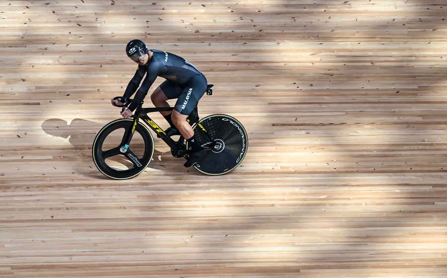 Umar Bin Hasbullah of Malaysia competes during the Cycling Track Men's Team Sprint First Round at the 19th Asian Games in Hangzhou, east China's Zhejiang Province, Sept. 26, 2023. (Xinhua/Hu Huhu)