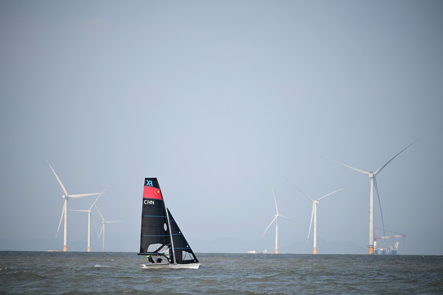 Hu Xiaoyu/Shan Mengyuan of China compete during the Women's Skiff 49erFX Race of sailing at the 19th Asian Games in Ningbo, east China's Zhejiang Province, Sept. 26, 2023. (Xinhua/Chen Bin)