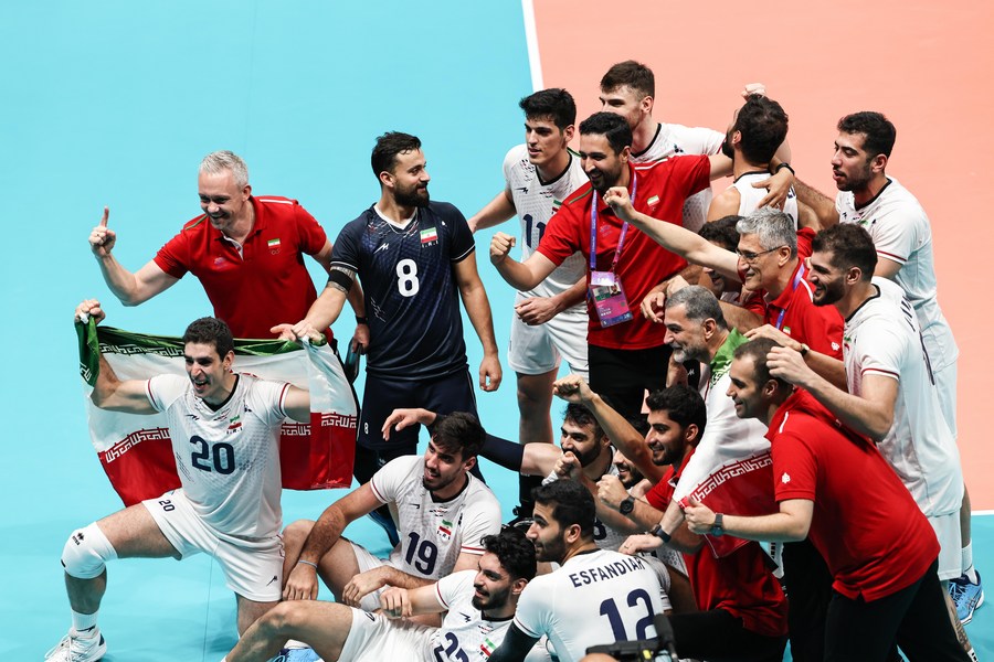 Team Iran celebrate after the gold medal match of volleyball between China and Iran at the 19th Asian Games in Hangzhou, east China's Zhejiang Province, Sept. 26, 2023. (Xinhua/Zhu Zheng)