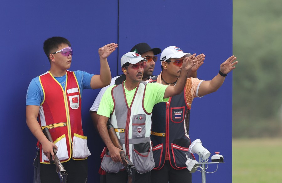 Athletes are seen during Men's Team Skeet-75 of Shooting at the 19th Asian Games in Hangzhou, east China's Zhejiang Province, Sept. 26, 2023. (Xinhua/Du Xiaoyi)
