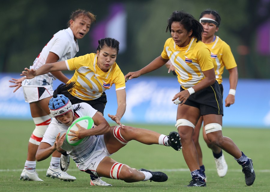 Li Nim Yan Melody Blessing (down) of China's Hong Kong competes during the Women's Bronze Medal Match of Rugby Sevens between China's Hong Kong and Thailand at the 19th Asian Games in Hangzhou, east China's Zhejiang Province, Sept. 26, 2023. (Xinhua/Jia Haocheng)