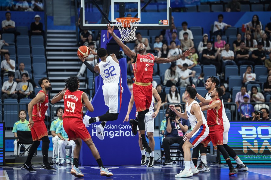 Justin Brownlee (3rd L) of the Philippines competes during the Men's Preliminary Round match of Basketball between the Philippines and Bahrain at the 19th Asian Games in Hangzhou, east China's Zhejiang Province, Sept. 26, 2023. (Xinhua/Pan Yulong)