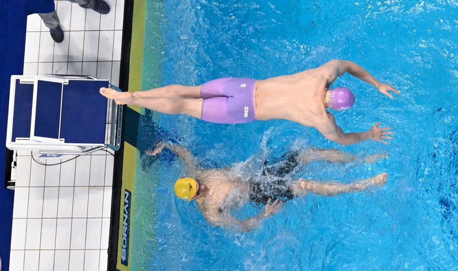 Xu Jiayu (bottom) and Qin Haiyang compete during the men's 4x100m medley relay final at the 19th Asian Games in Hangzhou, east China's Zhejiang Province, Sept. 26, 2023. (Xinhua/Xia Yifang)