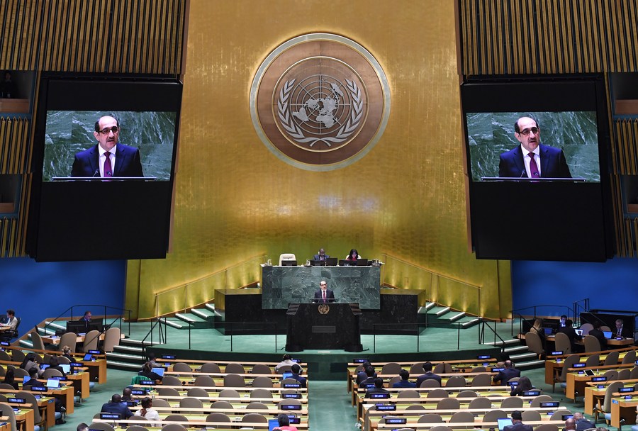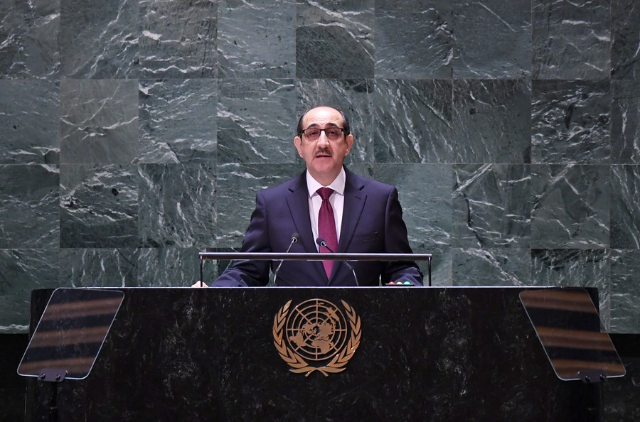 Syrian Vice Foreign Minister Bassam Sabbagh delivers a speech at the General Debate of the 78th session of the UN General Assembly at the UN headquarters in New York, on Sept. 26, 2023. (Xinhua/Li Rui)