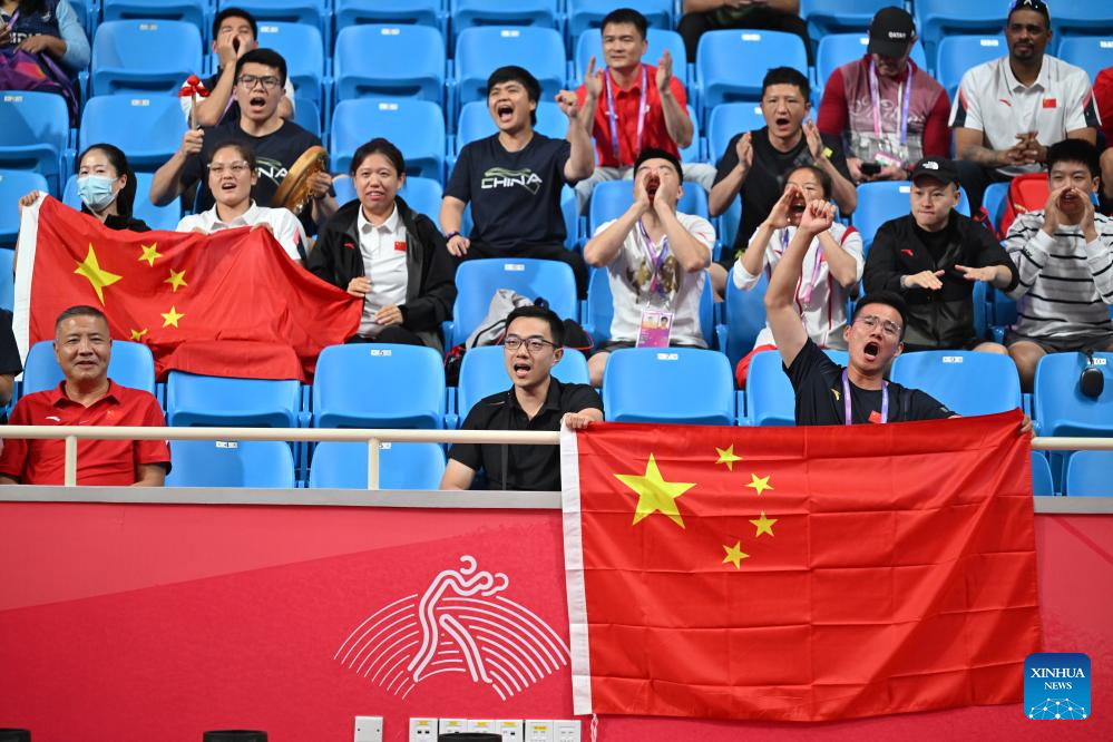 People cheer for Lyu Ping of China during Boxing Men's 51-57kg Preliminaries round of 32 between China and Iran at the 19th Asian Games in Hangzhou, east China's Zhejiang Province, Sept. 25, 2023. (Xinhua/Zhan Yan)