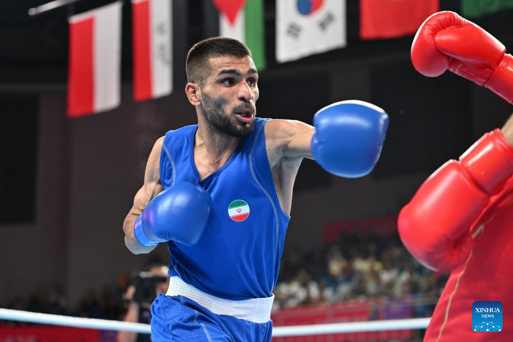 Daniyal Shahbakhsh of Iran competes during Boxing Men's 51-57kg Preliminaries round of 32 between China and Iran at the 19th Asian Games in Hangzhou, east China's Zhejiang Province, Sept. 25, 2023. (Xinhua/Zhan Yan)