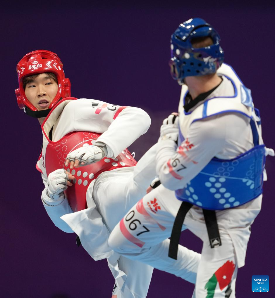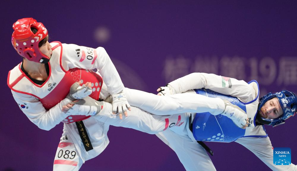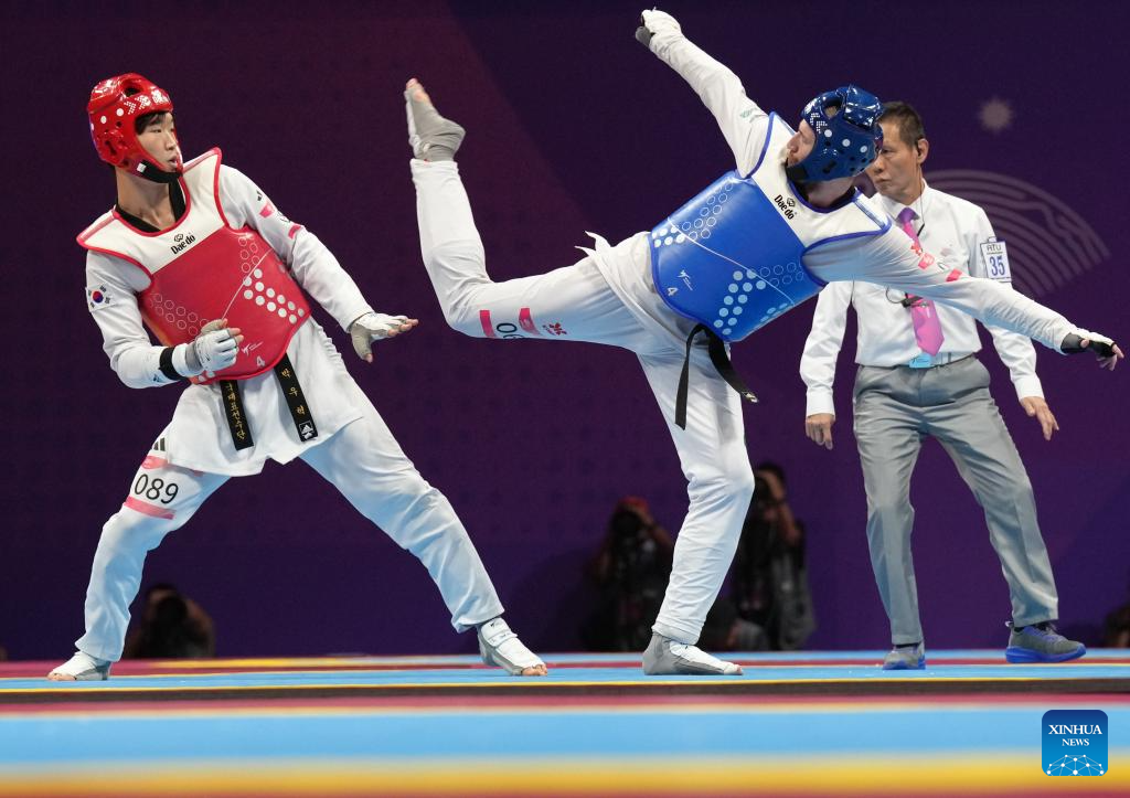 Jordan's Elsharabaty Saleh (R) competes with South Korea's Park Woohyeok during the Men's 80Kg Gold Medal Contest of Taekwondo at the 19th Asian Games in Hangzhou, east China's Zhejiang Province, Sept. 27, 2023. (Xinhua/Jiang Wenyao)