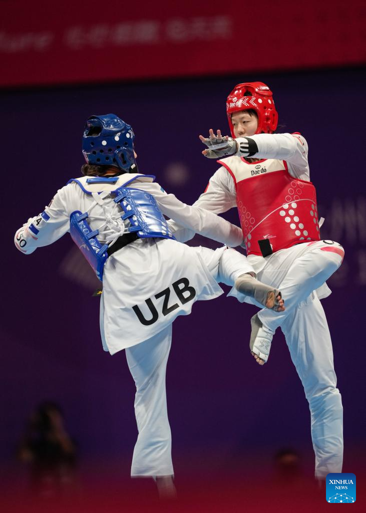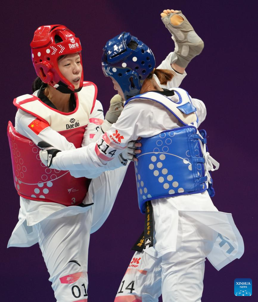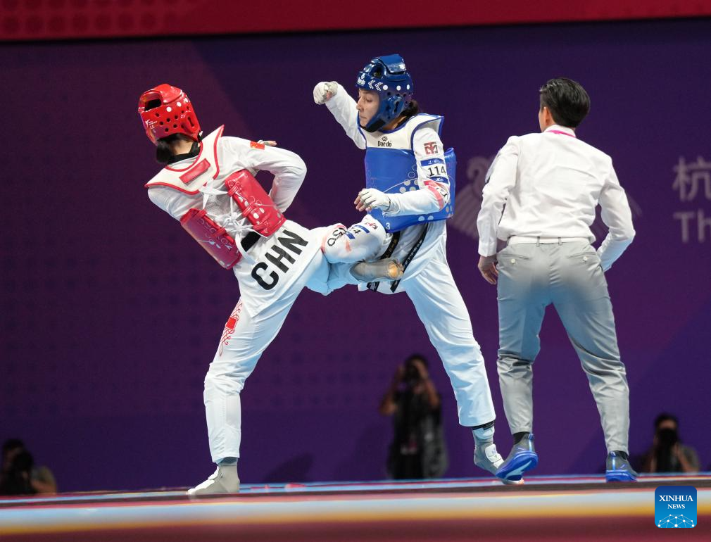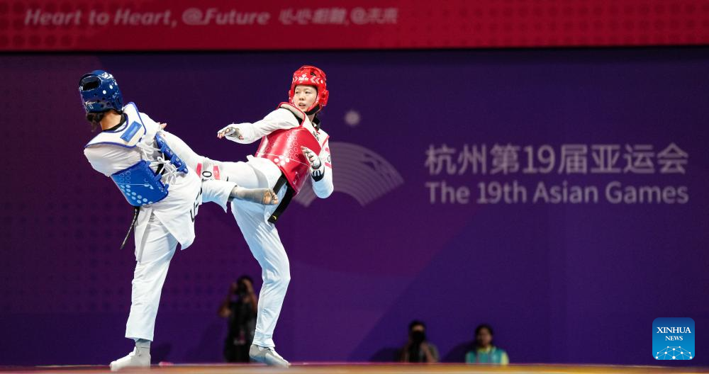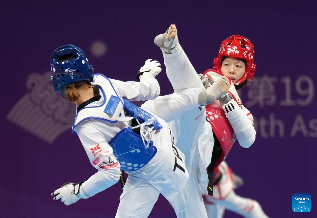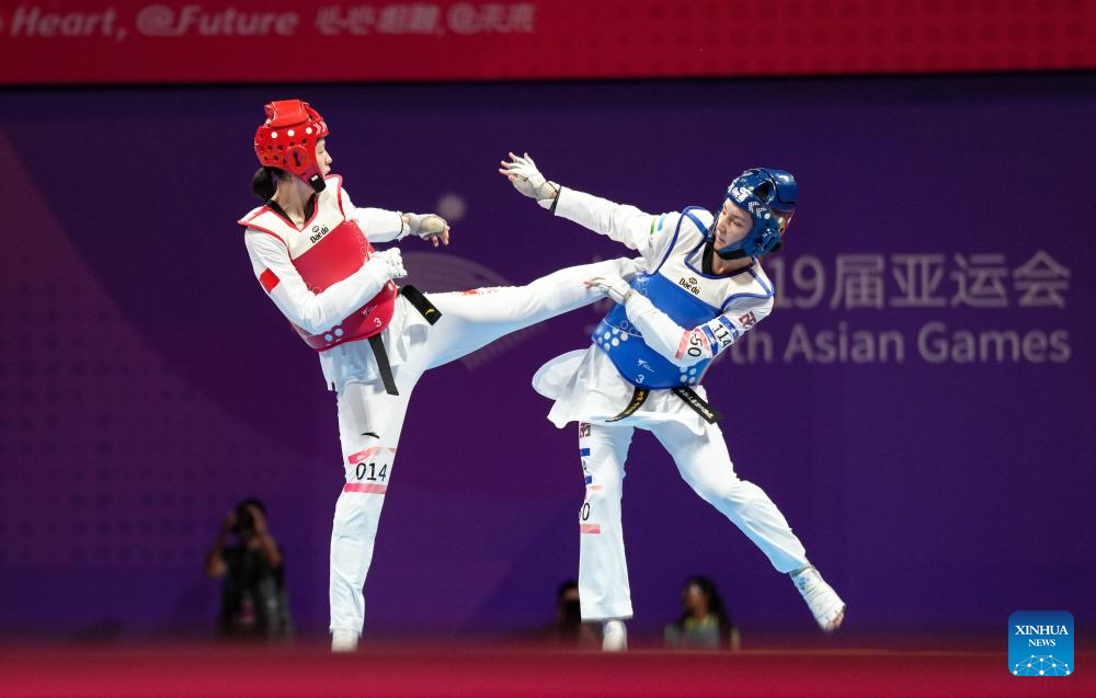 Song Jie (R) of China competes against Feruza Sadikova of Uzbekistan during the Women's 67kg Gold Medal contest of Taekwondo at the 19th Asian Games in Hangzhou, east China's Zhejiang Province, Sept. 27, 2023. (Xinhua/Jiang Wenyao)