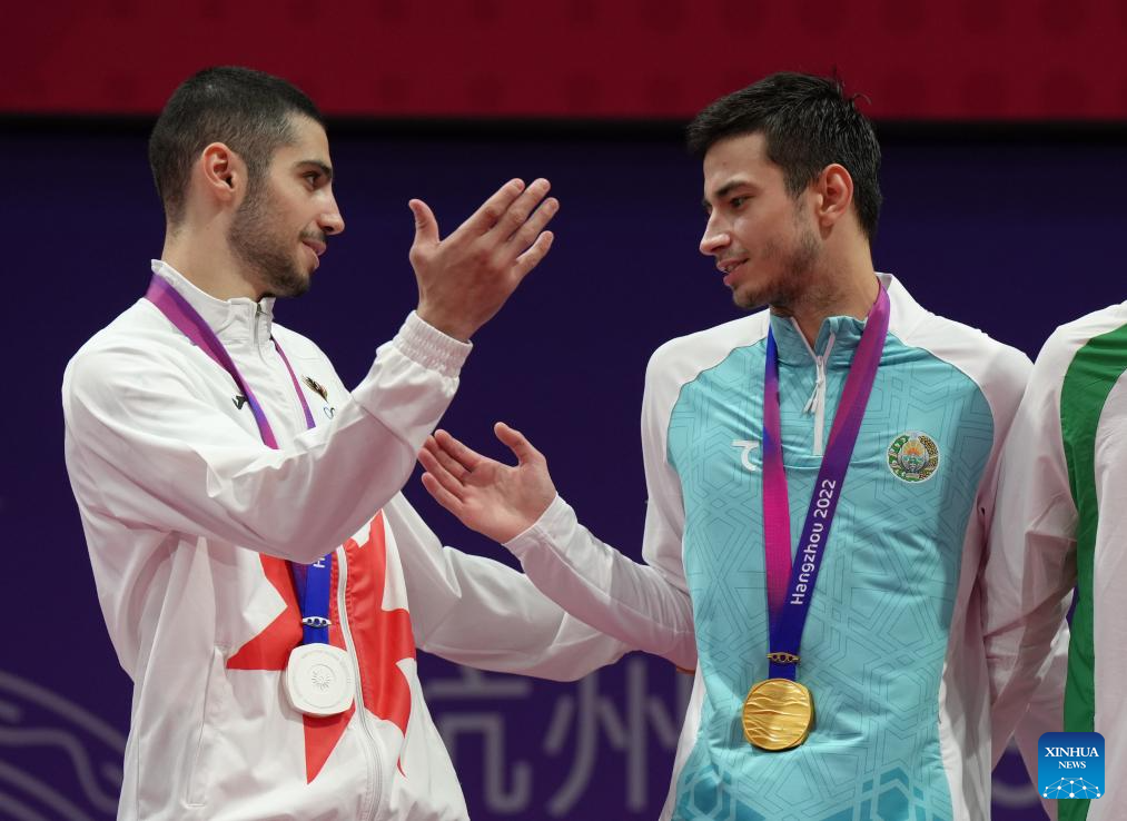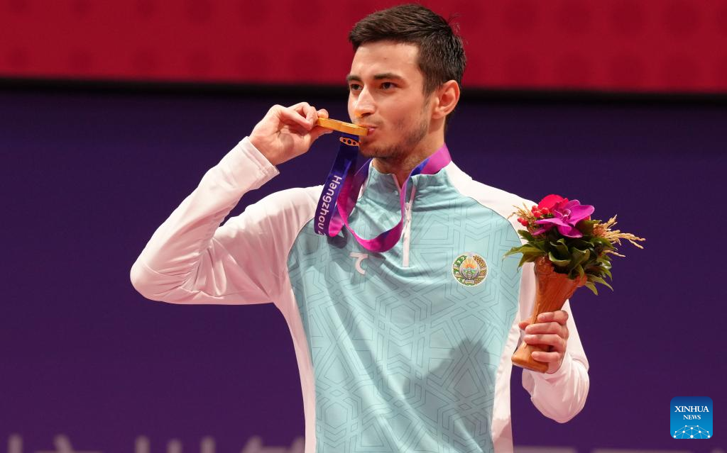 Gold medalist Ulugbek Rashitov of Uzbekistan attends the awarding ceremony for the Men's 68Kg Gold Medal contest of Taekwondo at the 19th Asian Games in Hangzhou, east China's Zhejiang Province, Sept. 27, 2023. (Xinhua/Jiang Wenyao)