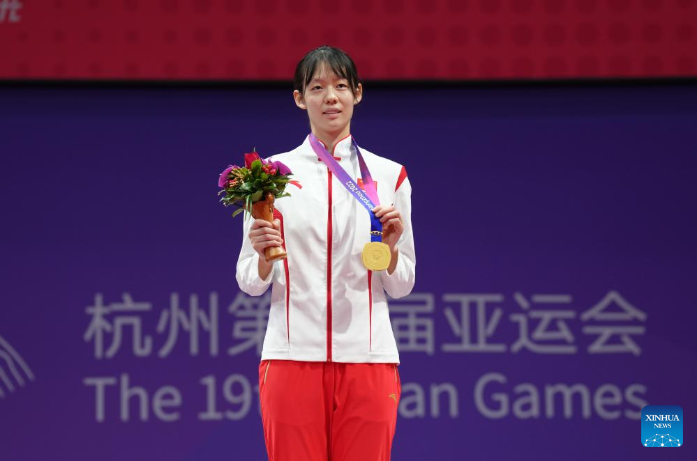 Gold medalist Song Jie of China attends the awarding ceremony for the Women's 67kg contest of Taekwondo at the 19th Asian Games in Hangzhou, east China's Zhejiang Province, Sept. 27, 2023. (Xinhua/Jiang Wenyao)