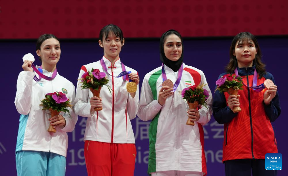 Gold medalist Song Jie (2nd L) of China, silver medalist Feruza Sadikova (1st L) of Uzbekistan, bronze medalist Bac Thi Khiem (1st R) of Vietnam and Melika Mirhosseini Vakili of Iran attend the awarding ceremony for the Women's 67kg contest of Taekwondo at the 19th Asian Games in Hangzhou, east China's Zhejiang Province, Sept. 27, 2023. (Xinhua/Jiang Wenyao)