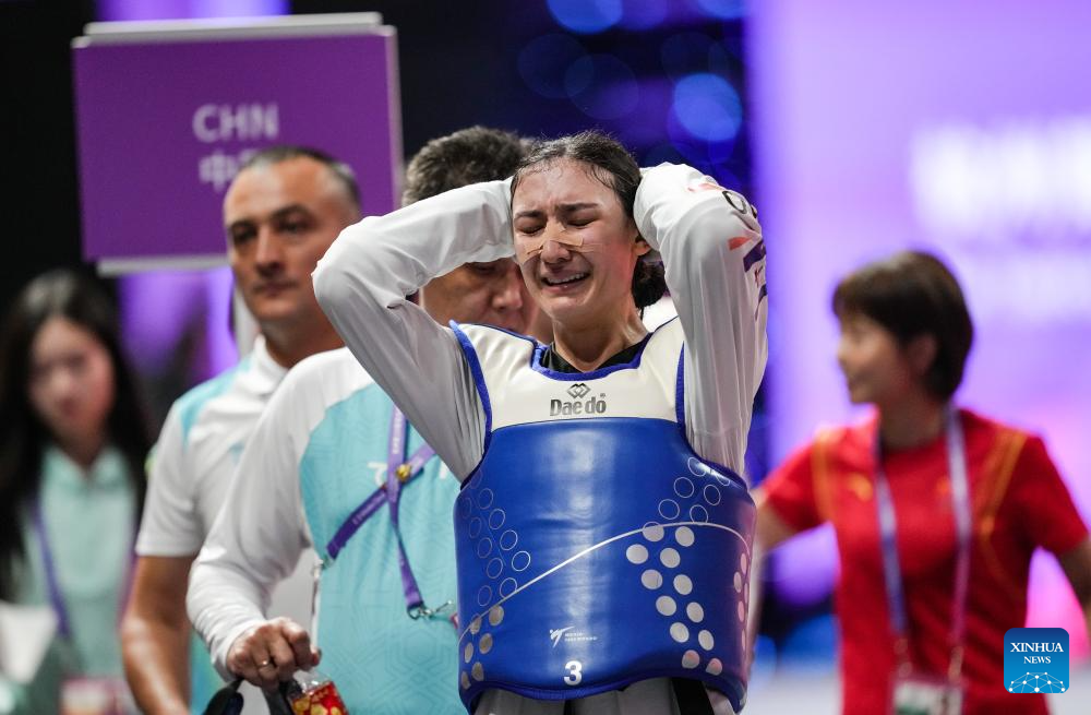 Feruza Sadikova of Uzbekistan reacts after the Women's 67kg Gold Medal contest of Taekwondo at the 19th Asian Games in Hangzhou, east China's Zhejiang Province, Sept. 27, 2023. (Xinhua/Jiang Wenyao)