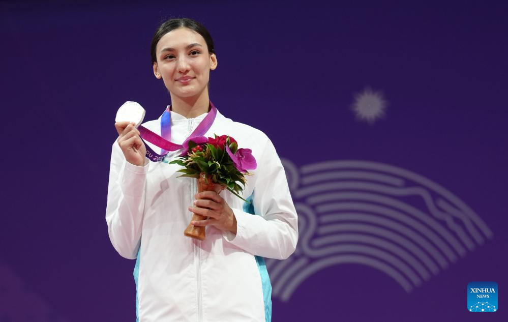 Silver medalist Feruza Sadikova of Uzbekistan attends the awarding ceremony for the Women's 67kg contest of Taekwondo at the 19th Asian Games in Hangzhou, east China's Zhejiang Province, Sept. 27, 2023. (Xinhua/Jiang Wenyao)