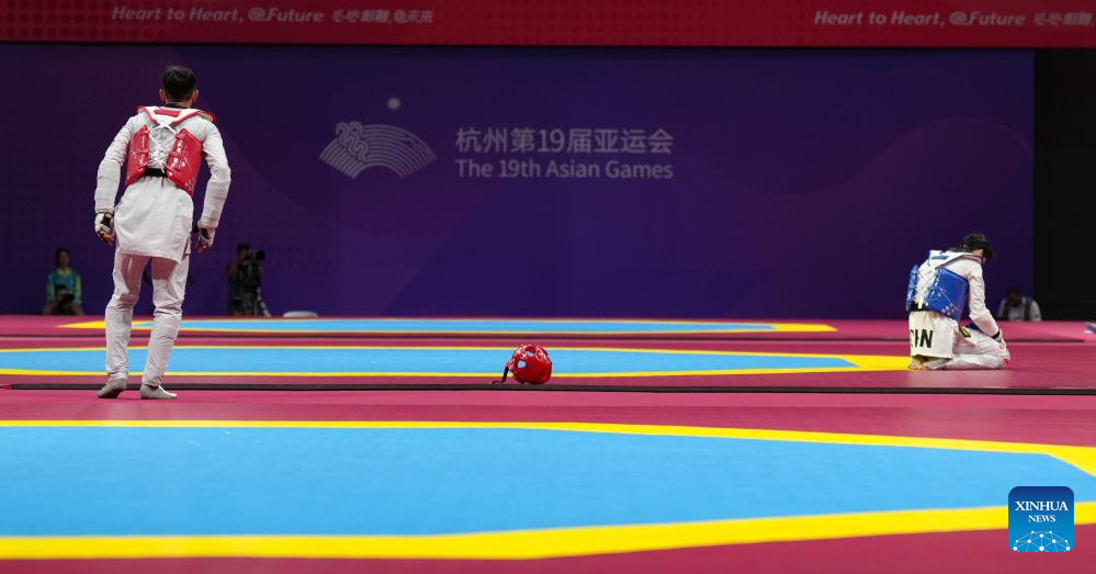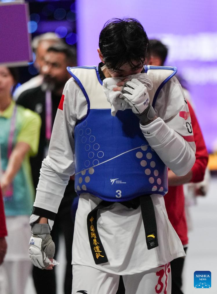Xiao Chenming of China reacts after the Men's 68kg Quarterfinal of Taekwondo at the 19th Asian Games in Hangzhou, east China's Zhejiang Province, Sept. 27, 2023. (Xinhua/Jiang Wenyao)