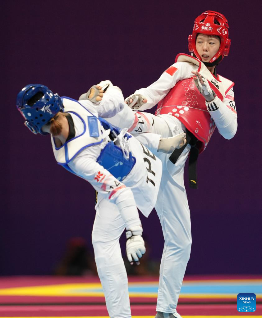 Song Jie of China (R) competes against Chang Jui En of Chinese Taipei during the Women's 67kg Quarterfinal of Taekwondo at the 19th Asian Games in Hangzhou, east China's Zhejiang Province, Sept. 27, 2023. (Xinhua/Jiang Wenyao)