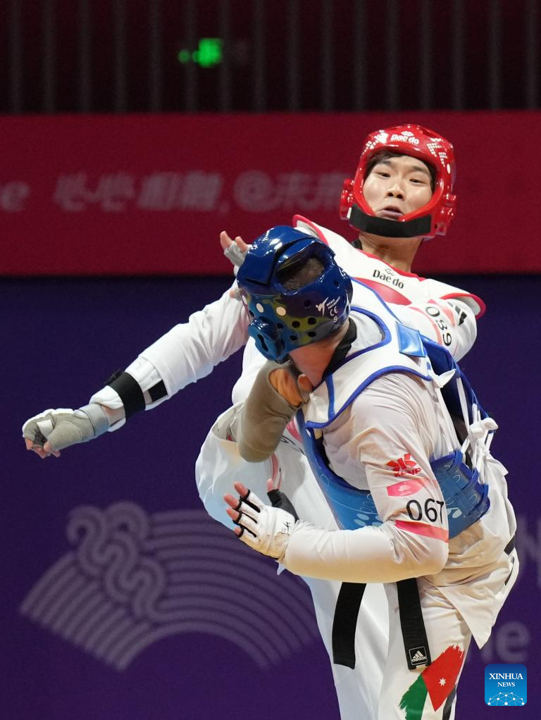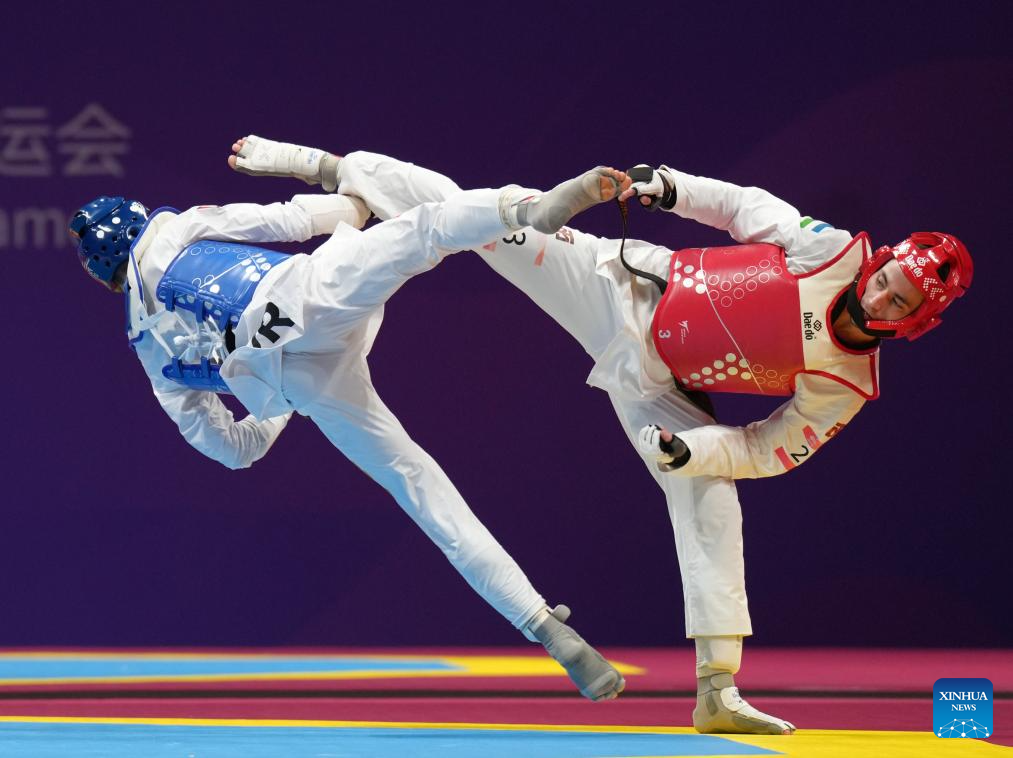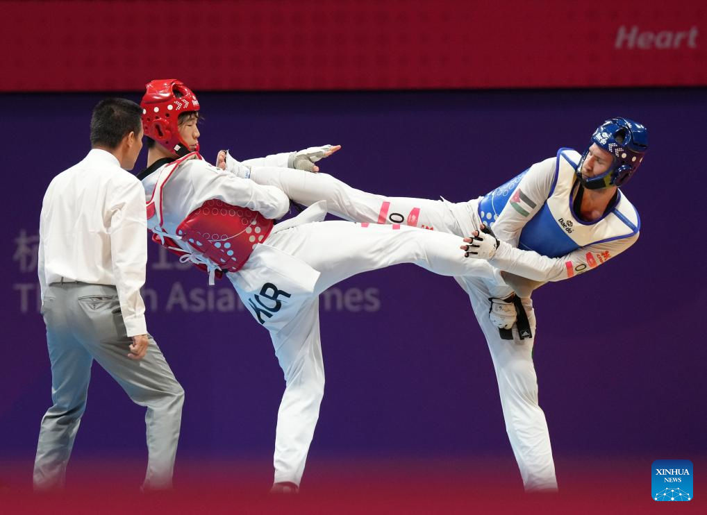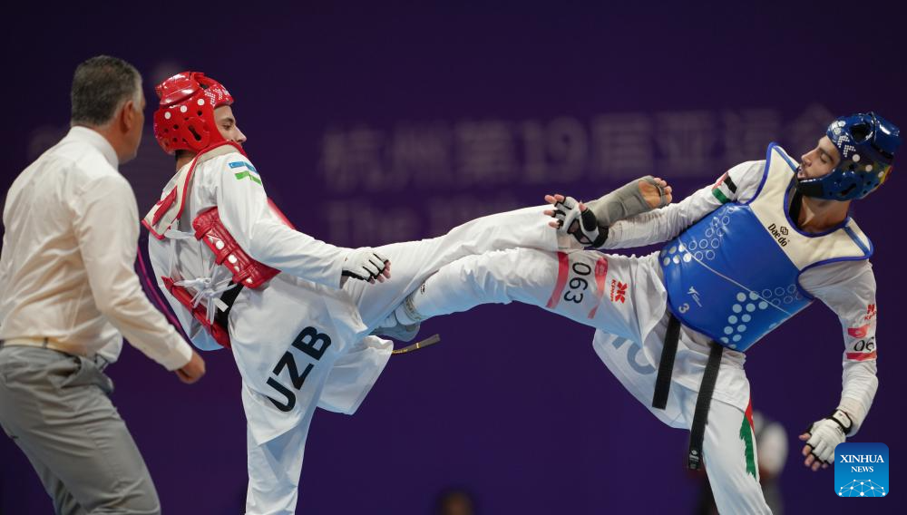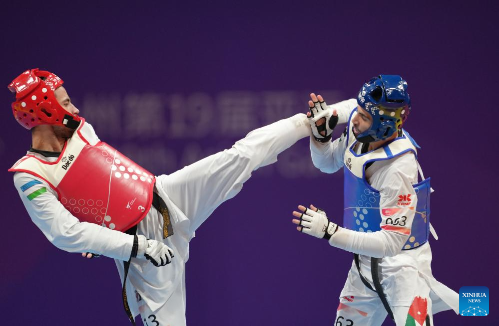 Ulugbek Rashitov (R) of Uzbekistan competes against Zaid Abdul Kareem of Jordan during the Men's 68Kg Gold Medal contest of Taekwondo at the 19th Asian Games in Hangzhou, east China's Zhejiang Province, Sept. 27, 2023. (Xinhua/Jiang Wenyao)