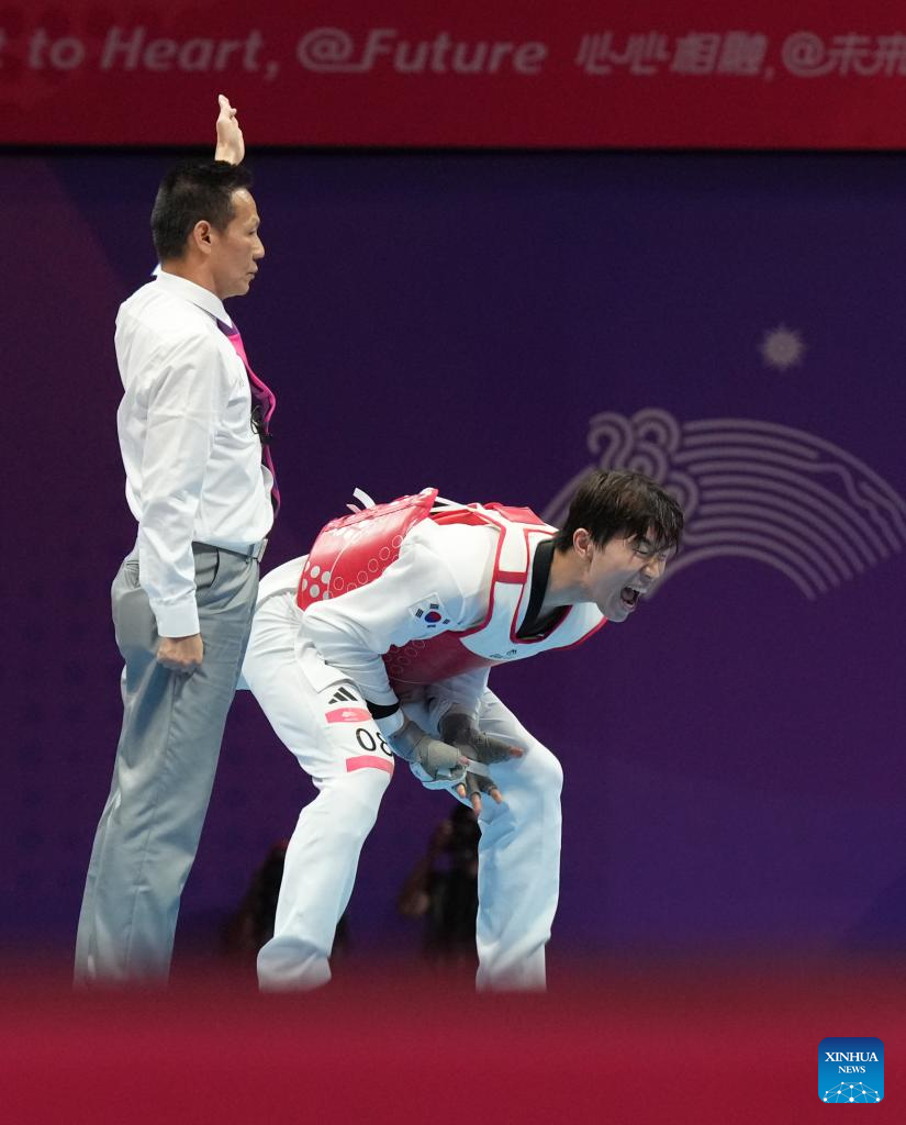 South Korea's Park Woohyeok reacts during the Men's 80Kg Gold Medal Contest of Taekwondo at the 19th Asian Games in Hangzhou, east China's Zhejiang Province, Sept. 27, 2023. (Xinhua/Jiang Wenyao)