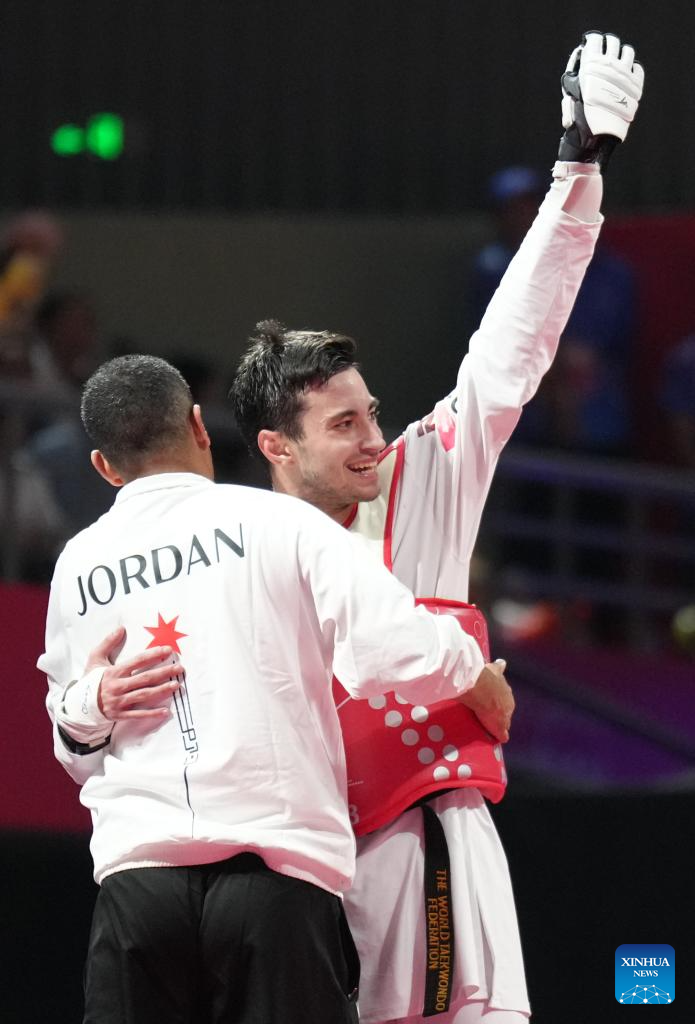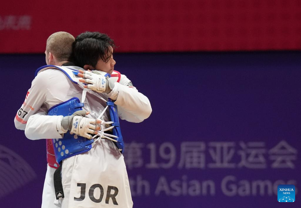 Ulugbek Rashitov (R) of Uzbekistan and Zaid Abdul Kareem of Jordan greet each other after the Men's 68Kg Gold Medal contest of Taekwondo at the 19th Asian Games in Hangzhou, east China's Zhejiang Province, Sept. 27, 2023. (Xinhua/Jiang Wenyao)