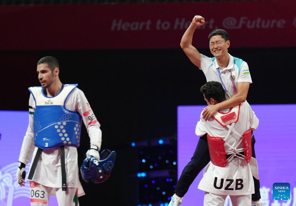 Ulugbek Rashitov (back) of Uzbekistan celebrats after the Men's 68Kg Gold Medal contest of Taekwondo at the 19th Asian Games in Hangzhou, east China's Zhejiang Province, Sept. 27, 2023. (Xinhua/Jiang Wenyao)