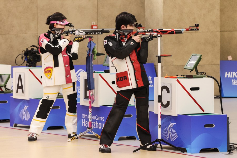 Park Ha-jun (R) and Lee Eun-seo of South Korea compete in the 10m air rifle mixed team at the Hangzhou Asian Games on Sept. 26, 2023. (Xinhua/Shan Yuqi)