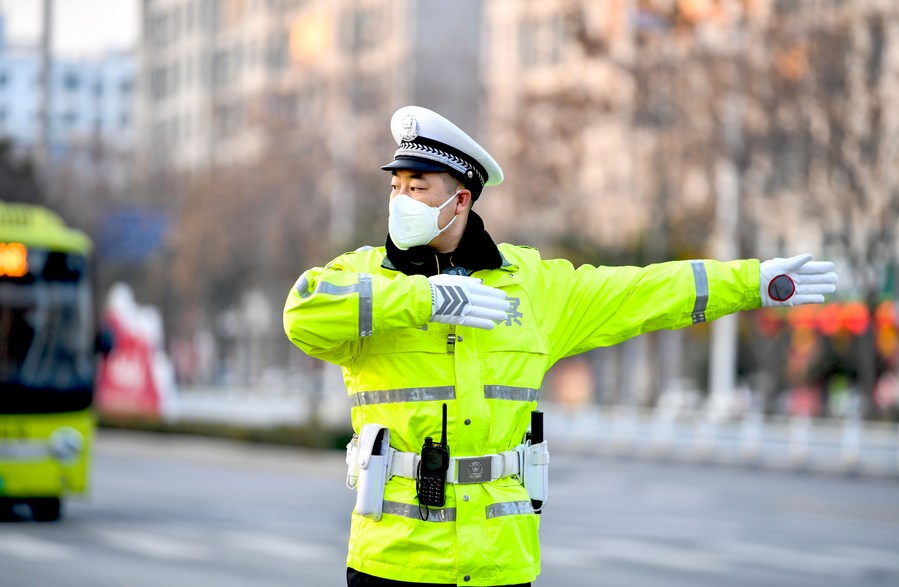 A traffic police officer works at a crossroad in Bozhou City, east China's Anhui Province, Jan. 21, 2023. (Photo by Liu Qinli/Xinhua)