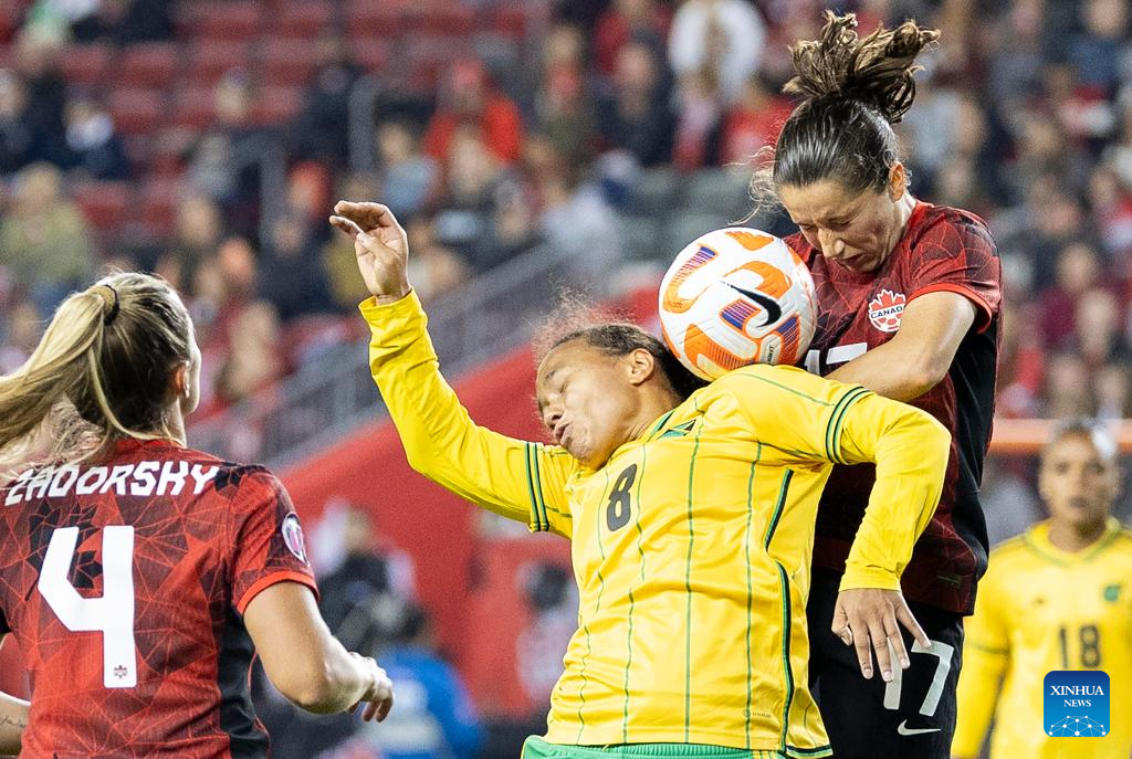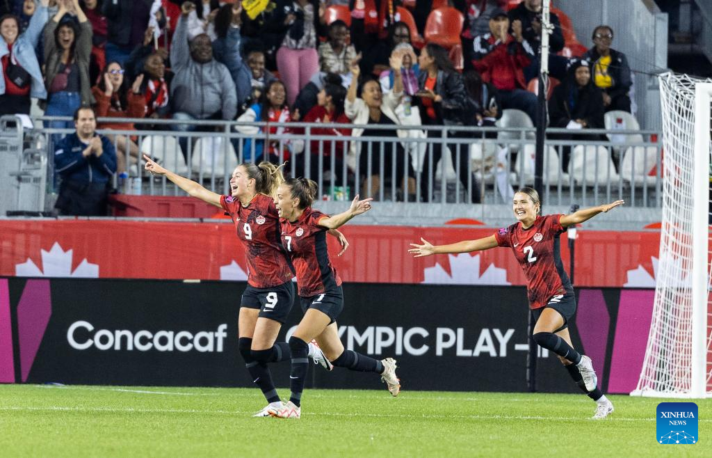 Players of Canada celebrate after scoring during the Play-In series second leg match of the CONCACAF Women's Olympic Qualifying between Canada and Jamaica at BMO Field in Toronto, Canada, on Sept. 26, 2023. Canada women's national soccer team advanced to the Paris 2024 Olympic Games on Tuesday. (Photo by Zou Zheng/Xinhua)