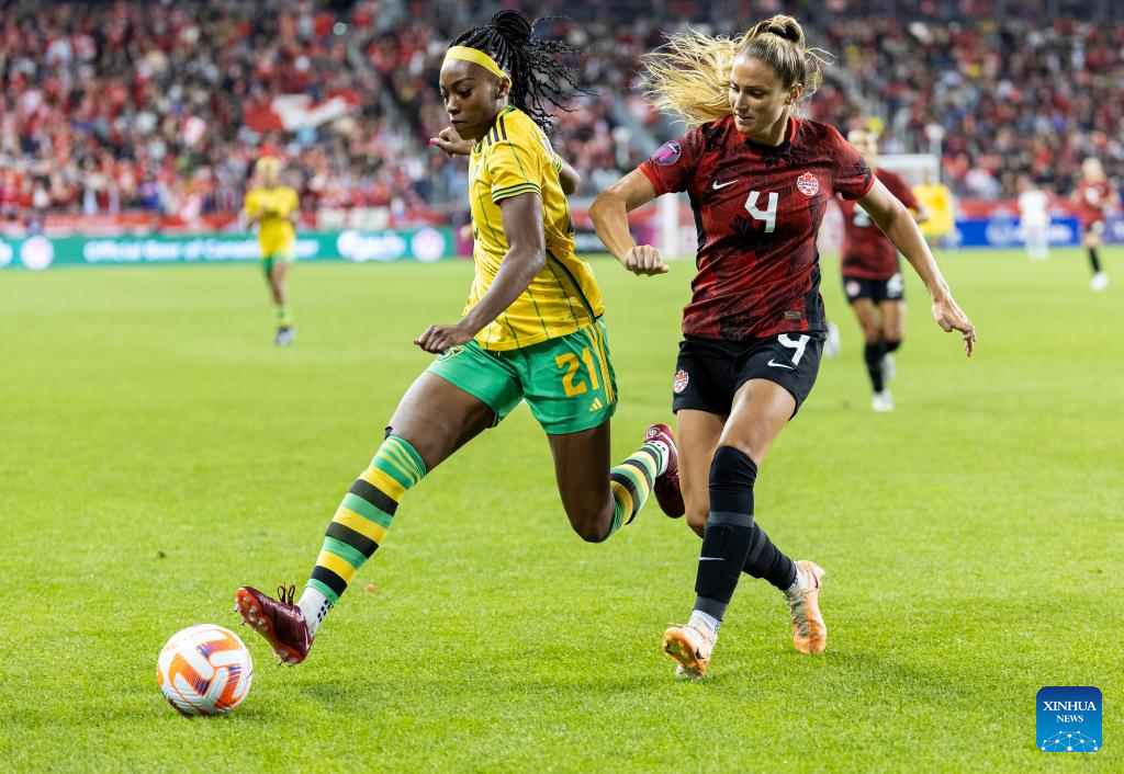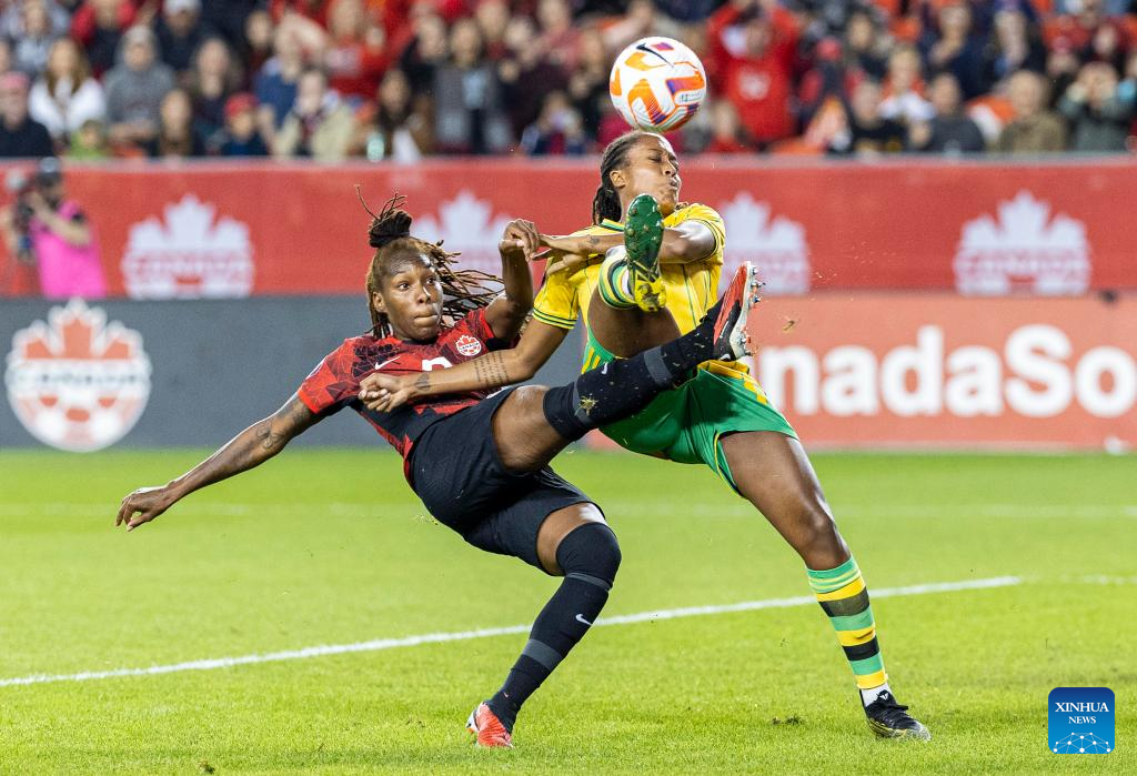 Shelina Zadorsky (R) of Canada vies with Cheyna Williams of Jamaica during their Play-In series second leg match of the CONCACAF Women's Olympic Qualifying at BMO Field in Toronto, Canada, on Sept. 26, 2023. Canada women's national soccer team advanced to the Paris 2024 Olympic Games on Tuesday. (Photo by Zou Zheng/Xinhua)