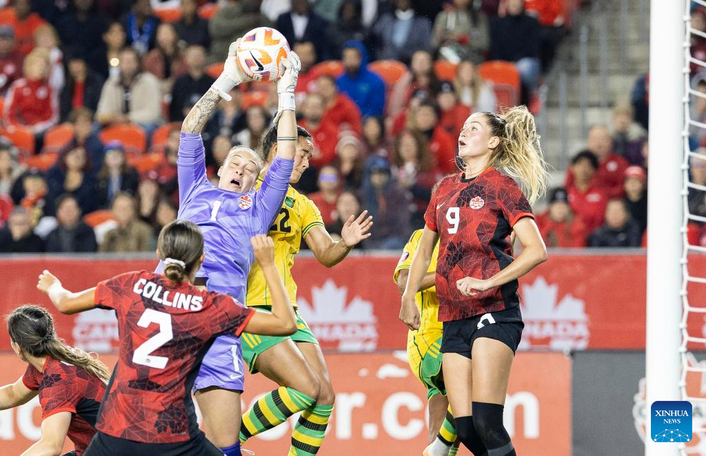 Goalkeeper Kailen Sheridan (3rd L) of Canada saves the ball during the Play-In series second leg match of the CONCACAF Women's Olympic Qualifying between Canada and Jamaica at BMO Field in Toronto, Canada, on Sept. 26, 2023. Canada women's national soccer team advanced to the Paris 2024 Olympic Games on Tuesday. (Photo by Zou Zheng/Xinhua)