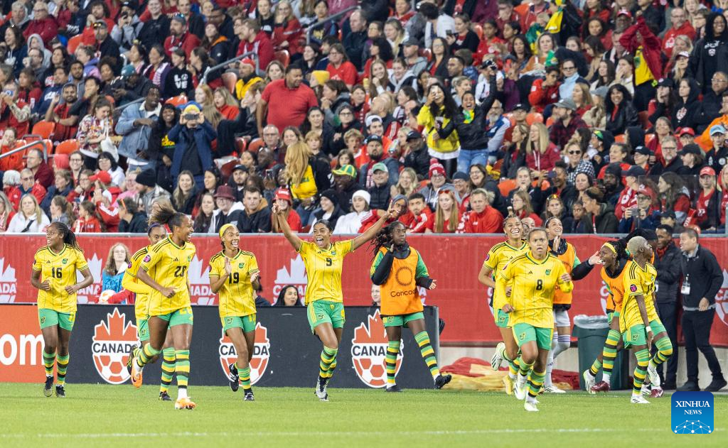 Players of Jamaica celebrate after scoring during the Play-In series second leg match of the CONCACAF Women's Olympic Qualifying between Canada and Jamaica at BMO Field in Toronto, Canada, on Sept. 26, 2023. Canada women's national soccer team advanced to the Paris 2024 Olympic Games on Tuesday. (Photo by Zou Zheng/Xinhua)