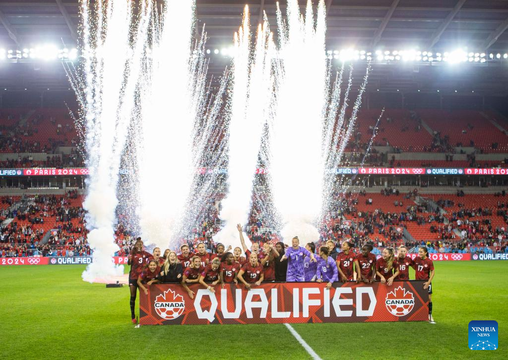 Players of Canada celebrate victory after the Play-In series second leg match of the CONCACAF Women's Olympic Qualifying between Canada and Jamaica at BMO Field in Toronto, Canada, on Sept. 26, 2023. Canada women's national soccer team advanced to the Paris 2024 Olympic Games on Tuesday. (Photo by Zou Zheng/Xinhua)