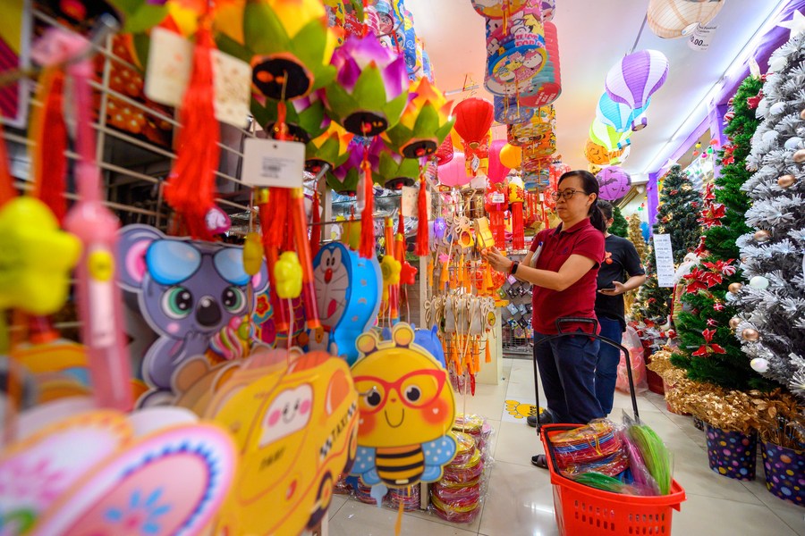 People buy decorations for the upcoming Mid-Autumn Festival in Kuala Lumpur, Malaysia, Sept. 23, 2023. (Photo by Chong Voon Chung/Xinhua)