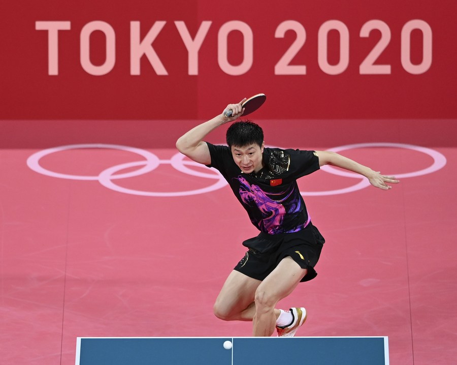 Ma returns the ball to Timo Boll in the men's team final between China and Germany at the Olympic Games in Tokyo, Japan on Aug. 6, 2021. (Xinhua/Huang Zongzhi)