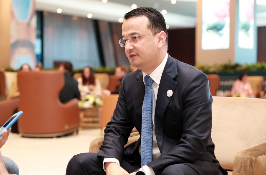 Laziz Kudratov, the governor of Uzbekistan at the Asian Infrastructure Investment Bank (AIIB) and also Uzbek minister of investment, industry and trade, speaks during an interview on the sidelines of the AIIB's two-day annual meeting in Sharm El-Sheikh, Egypt, on Sept. 26, 2023. (Xinhua/Sui Xiankai)