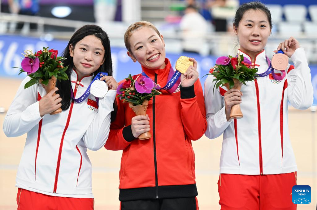 Gold Medalist Sato Mina (C) of Japan, Silver Medalist Wang Lijuan (L) of China and Bronze Medalist Zhang Linyin of China attend the awarding ceremony for Cycling Track Women's Keirin at the 19th Asian Games in Hangzhou, east China's Zhejiang Province, Sept. 27, 2023. (Xinhua/Hu Huhu)