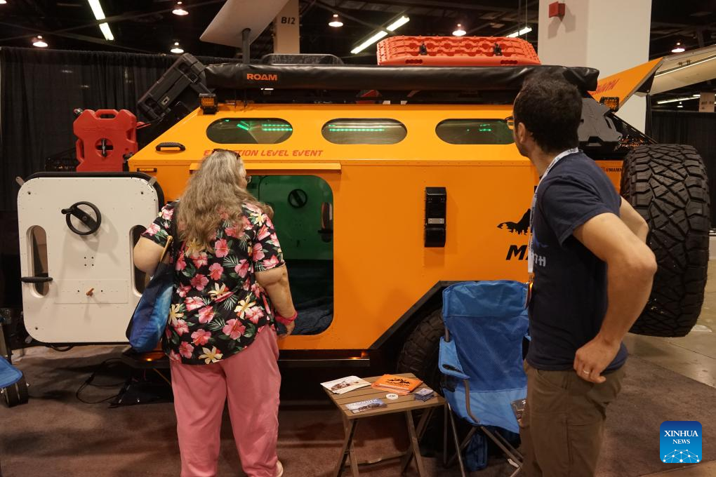 Visitors look at a vehicle during Disasters Expo USA at the Anaheim Convention Center in Orange County, California, the United States, on Sept. 27, 2023. Disasters Expo USA kicked off Wednesday in Southern California, focusing on the leading preparation, management, and recovery solutions for natural disasters. (Photo by Zeng Hui/Xinhua)