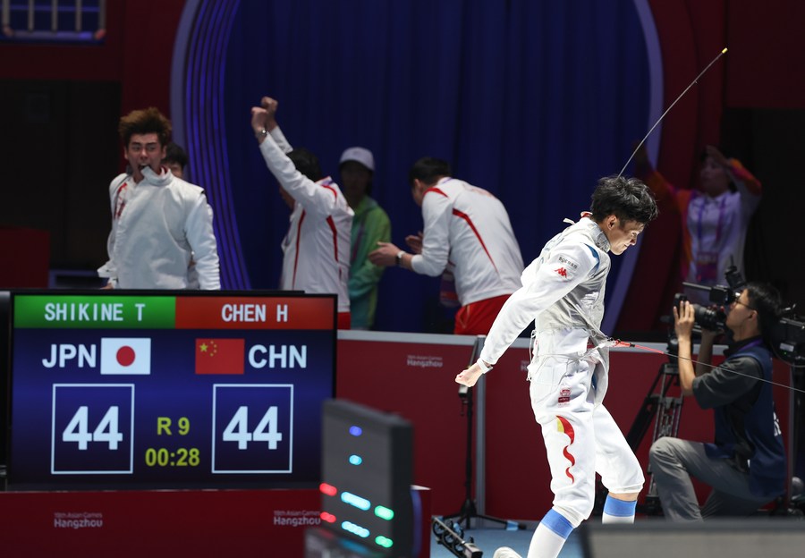 Chinese fencers kept up with a close advantage but were tied at 43-all in the final moments. Shikine took the match point, but Chen, who lost 6-1 to the same opponent in the last round of the World Championships final, held his nerve to win the thriller 45-44.
