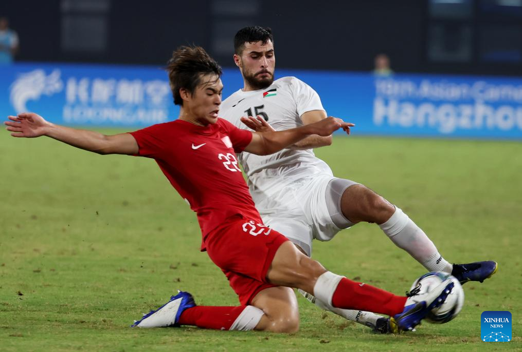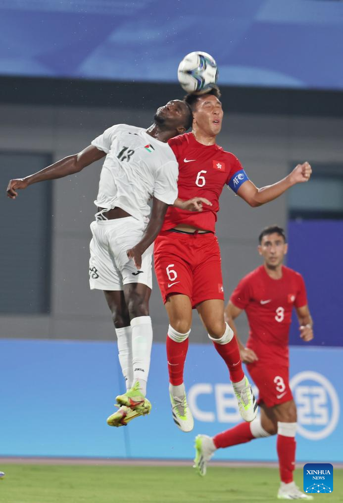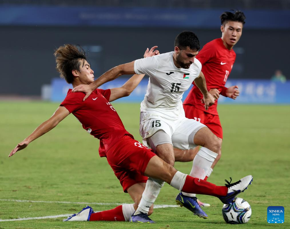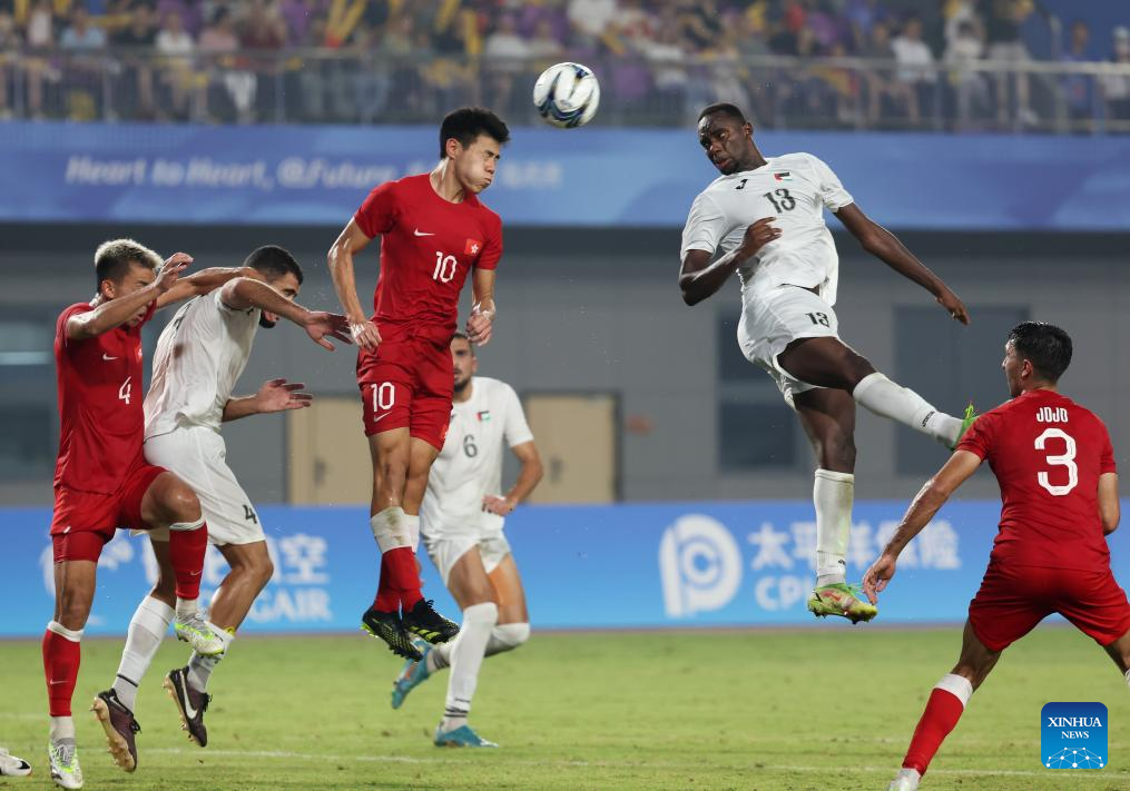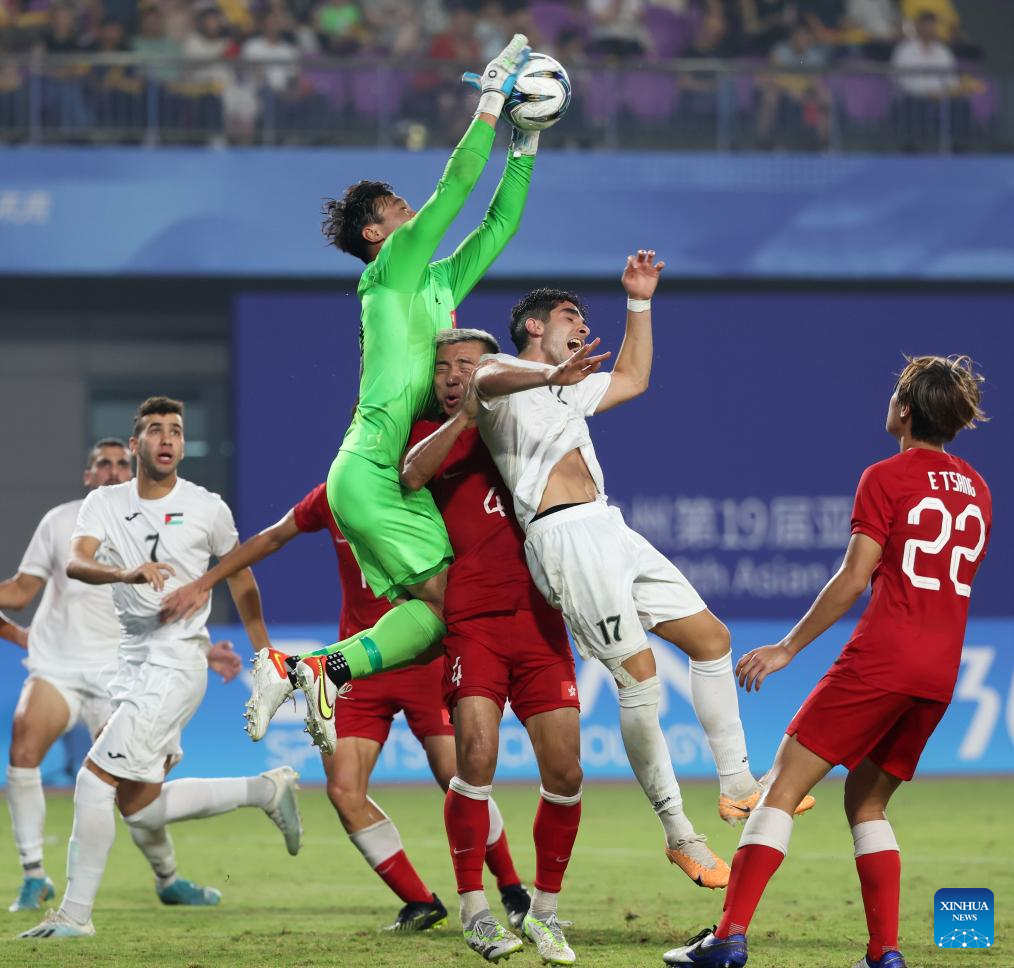 Players compete during the Men's Round of 16 between China's Hong Kong and Palestine at the 19th Asian Games in Hangzhou, east China's Zhejiang Province, Sept. 27, 2023. (Xinhua/Gong Bing)