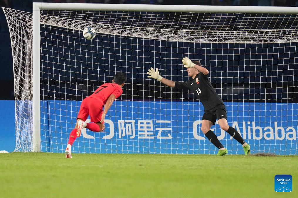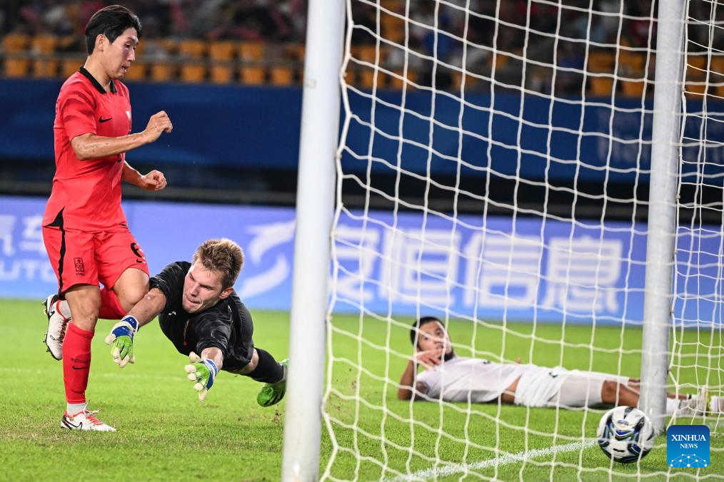 Hong Hyunseok (L) of South Korea scores during the Football Men's Round of 16 Match between South Korea and Kyrgyzstan at the 19th Asian Games in Jinhua, east China's Zhejiang Province, Sept. 27, 2023. (Xinhua/Chen Zhonghao)