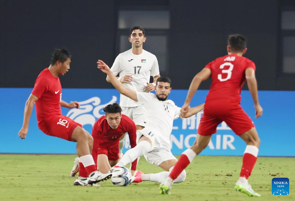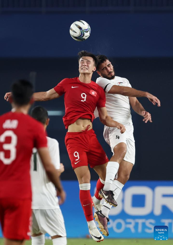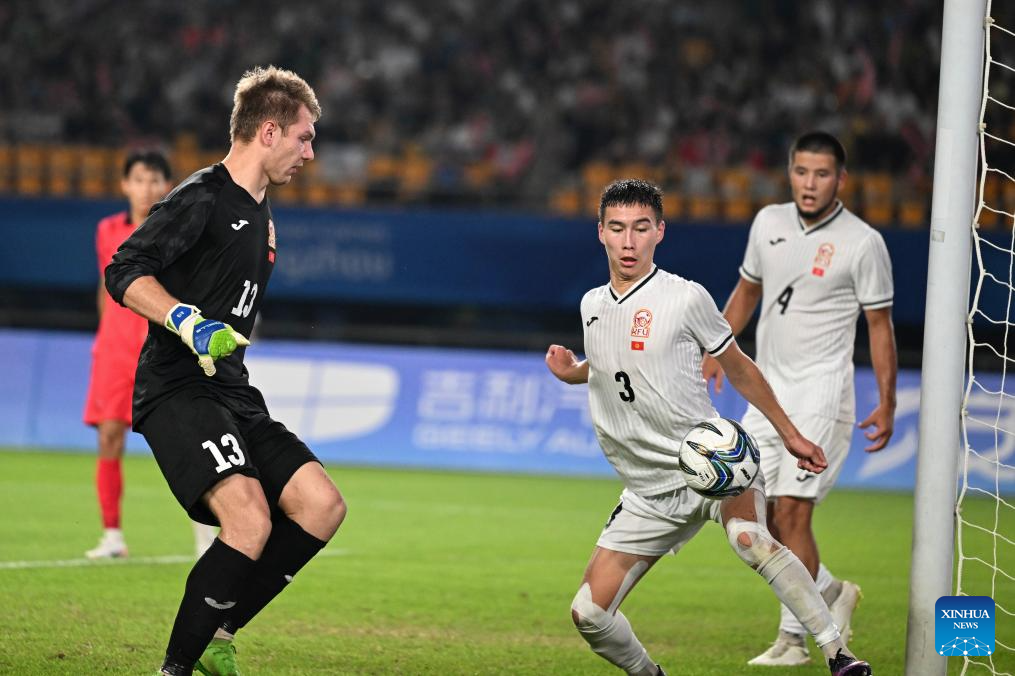 Elaman Akylbekov (C) of Kyrgyzstan competes during the Football Men's Round of 16 Match between South Korea and Kyrgyzstan at the 19th Asian Games in Jinhua, east China's Zhejiang Province, Sept. 27, 2023. (Xinhua/Chen Zhonghao)