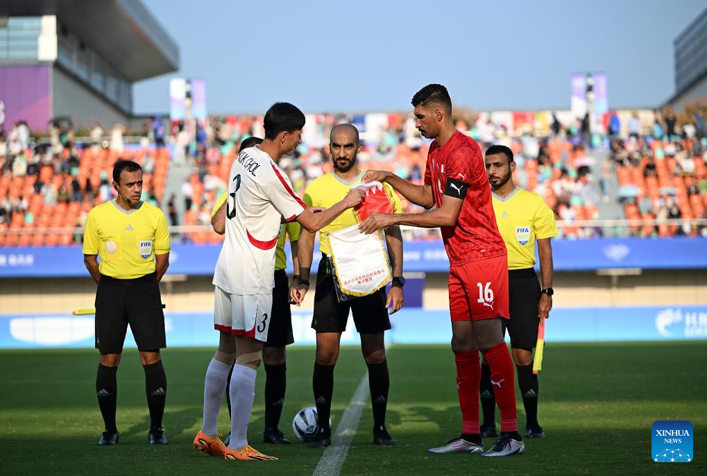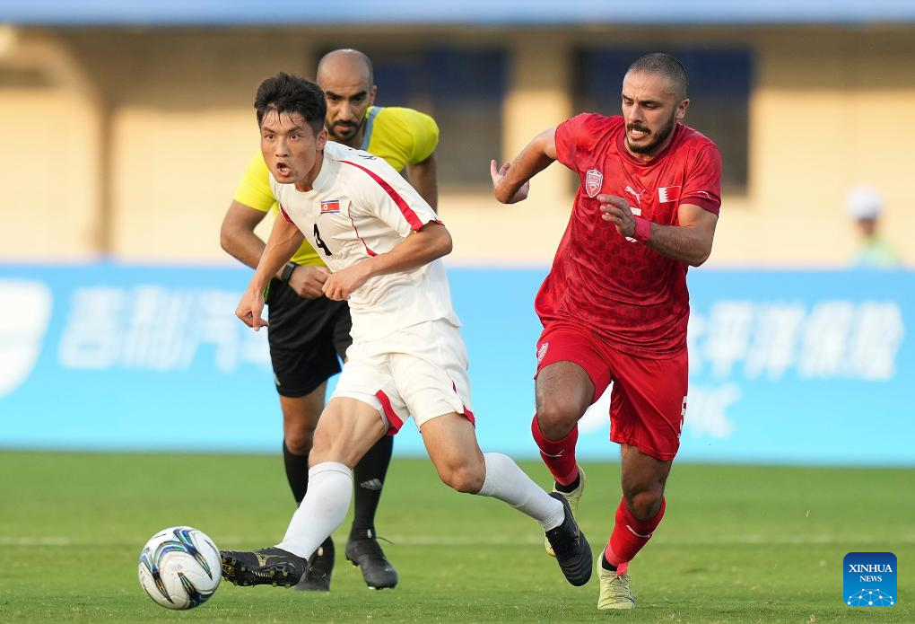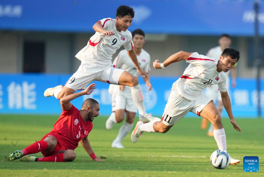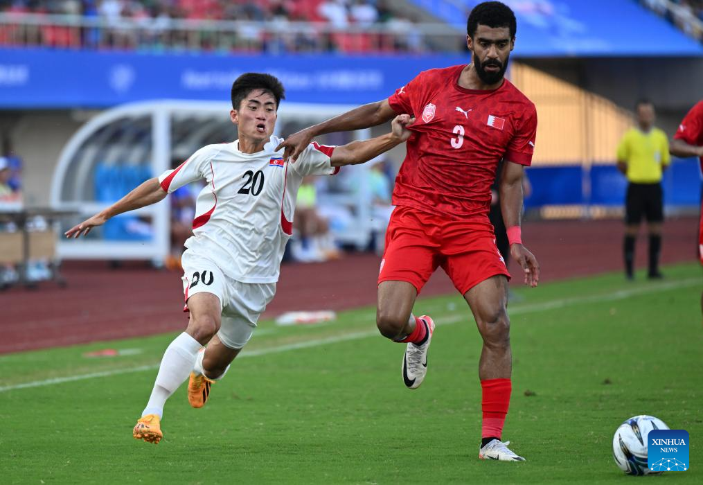 Players compete during the Football Men's Round of 16 Match between the Democratic People's Republic of Korea (DPRK) and Bahrain at the 19th Asian Games in Jinhua, east China's Zhejiang Province, Sept. 27, 2023. (Xinhua/Chen Zhonghao)