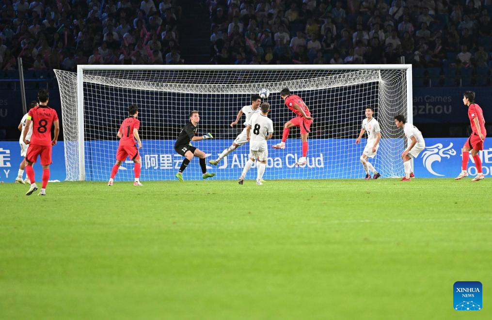 Jeong Wooyeong of South Korea scores with a header during the Football Men's Round of 16 Match between South Korea and Kyrgyzstan at the 19th Asian Games in Jinhua, east China's Zhejiang Province, Sept. 27, 2023. (Xinhua/Chen Zhonghao)