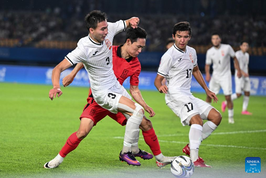 Um Wonsang (C) of South Korea vies with Elaman Akylbekov (L) and Arslan Bekberdinov of Kyrgyzstan during the Football Men's Round of 16 Match between South Korea and Kyrgyzstan at the 19th Asian Games in Jinhua, east China's Zhejiang Province, Sept. 27, 2023. (Xinhua/Chen Zhonghao)