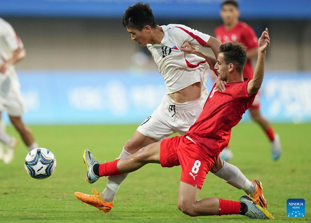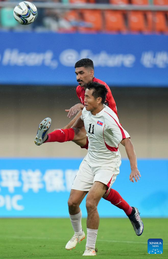 Kim Pomhyok (front) of the Democratic People's Republic of Korea (DPRK) competes during the Football Men's Round of 16 Match between the Democratic People's Republic of Korea (DPRK) and Bahrain at the 19th Asian Games in Jinhua, east China's Zhejiang Province, Sept. 27, 2023. (Xinhua/Chen Zhonghao)