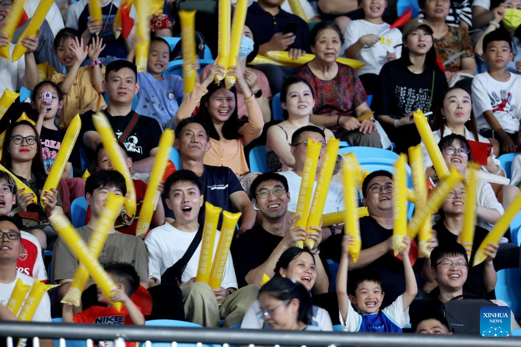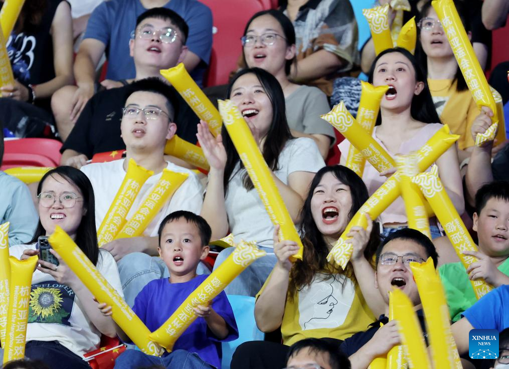 Audience cheer during the Men's Round of 16 between China's Hong Kong and Palestine at the 19th Asian Games in Hangzhou, east China's Zhejiang Province, Sept. 27, 2023. (Xinhua/Gong Bing)