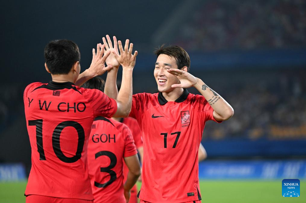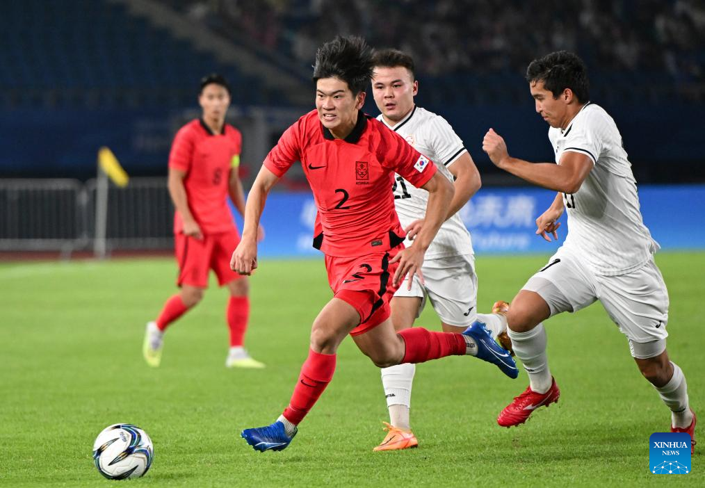 Hwang Jaewon (3rd R) of South Korea competes during the Football Men's Round of 16 Match between South Korea and Kyrgyzstan at the 19th Asian Games in Jinhua, east China's Zhejiang Province, Sept. 27, 2023. (Xinhua/Chen Zhonghao)
