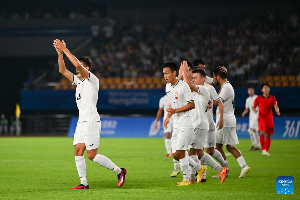 Players of Kyrgyzstan celebrate during the Football Men's Round of 16 Match between South Korea and Kyrgyzstan at the 19th Asian Games in Jinhua, east China's Zhejiang Province, Sept. 27, 2023. (Xinhua/Chen Zhonghao)