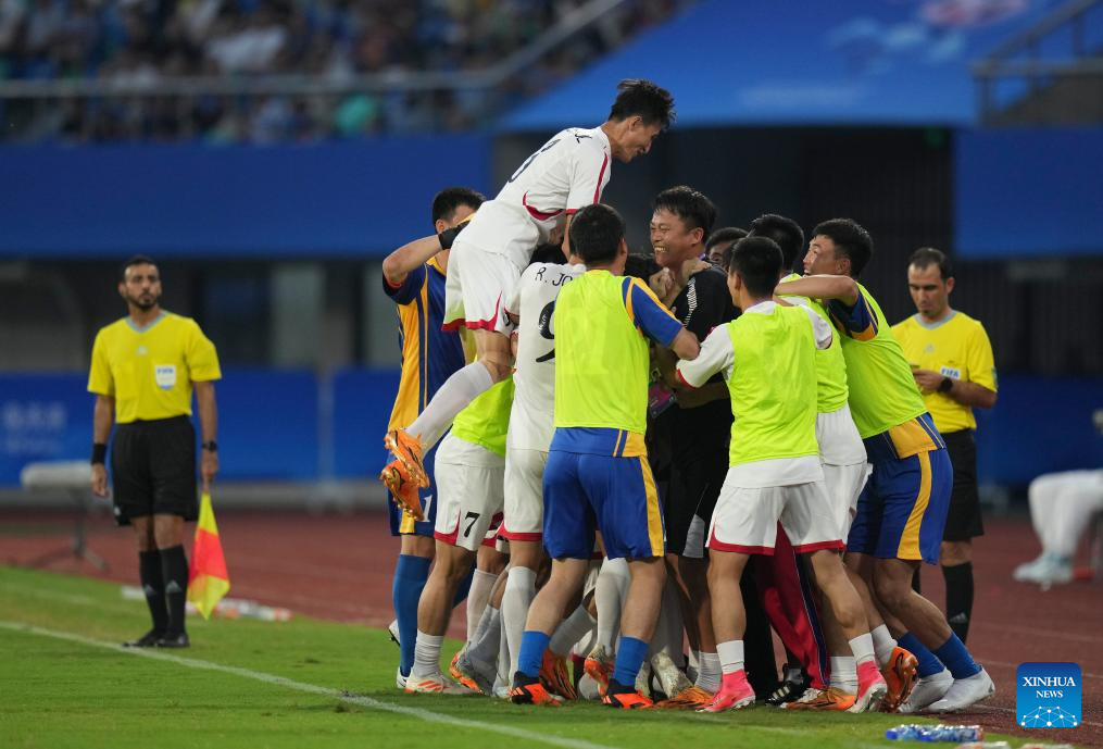 Players of the Democratic People's Republic of Korea (DPRK) celebrate during the Football Men's Round of 16 Match between the Democratic People's Republic of Korea (DPRK) and Bahrain at the 19th Asian Games in Jinhua, east China's Zhejiang Province, Sept. 27, 2023. (Xinhua/Chen Zhonghao)